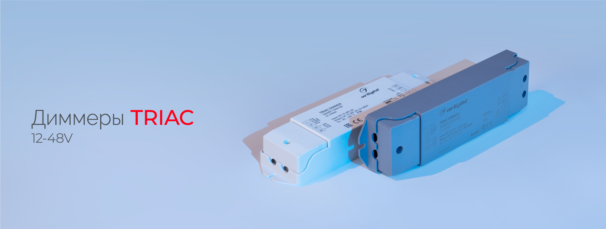 Диммеры TRIAC предназначены для включения, выключения и регулировки яркости различных светодиодных источников света с напряжением питания 12–48 В, таких как светодиодные ленты, линейные прожекторы и другие устройства, поддерживающие управление симисторными светорегуляторами.