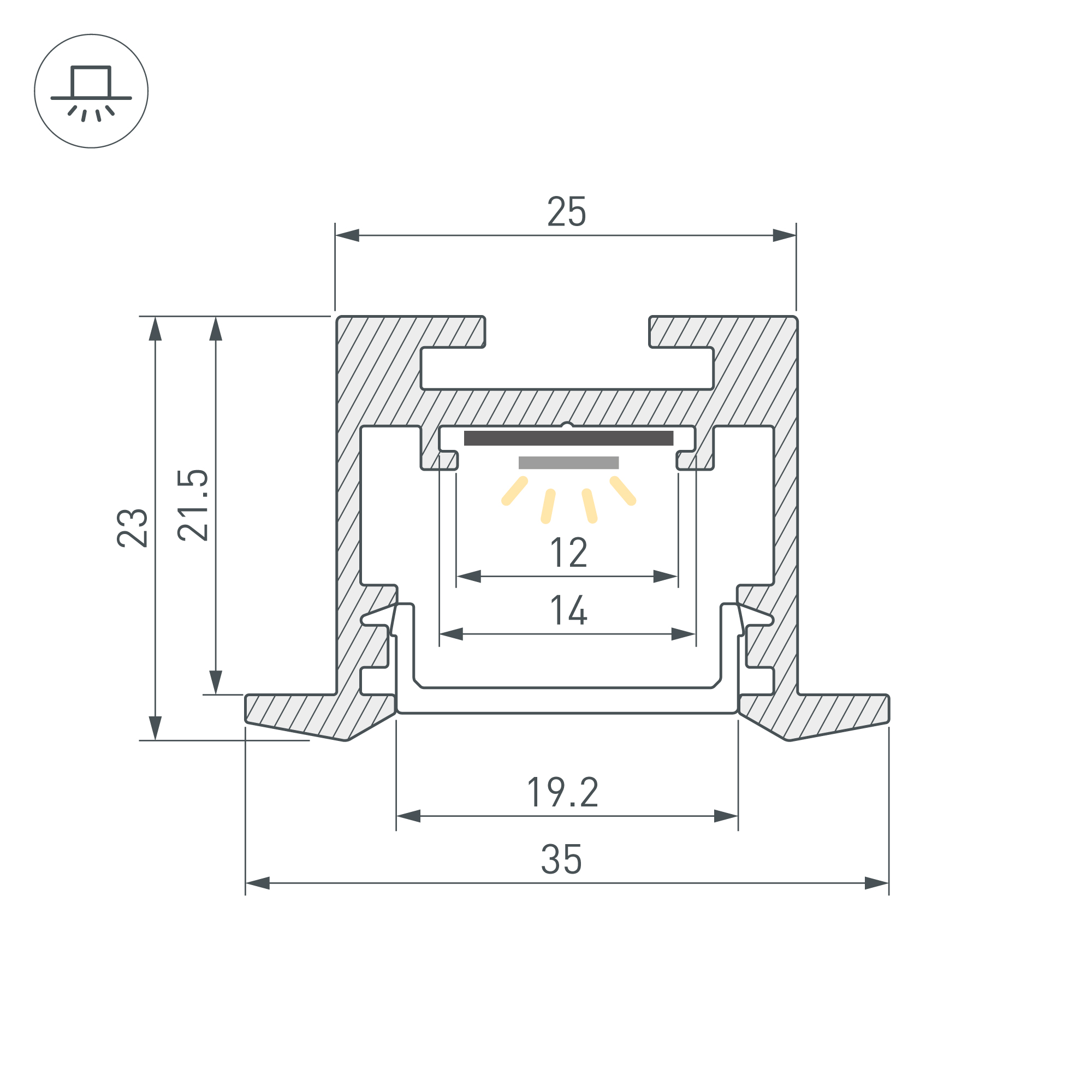 Алюминиевый профиль для светодиодных лент и линеек. Цвет - черный RAL9005 (порошковая окраска). Габаритные размеры (L×W×H): 2500x35,6x23,2 мм, паз для установки 25 мм. Ширина площадки для ленты 12 мм. Экраны, заглушки и другие аксессуары приобретаются отдельно. Цена за 1 метр.