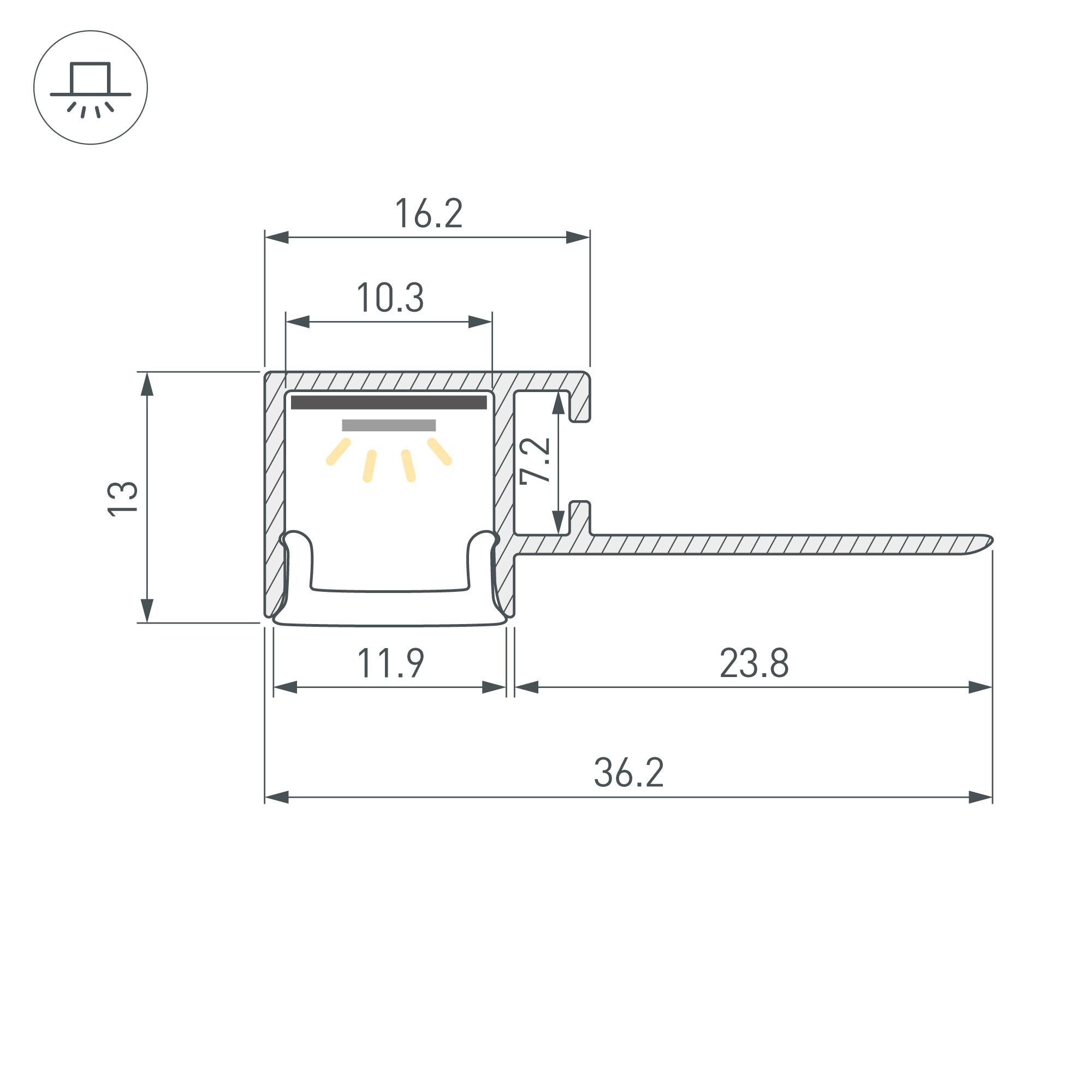 Алюминиевый встраиваемый гибкий профиль для светодиодных лент и линеек. Изгиб вверх/вниз. Минимальный радиус изгиба 20 см. Габаритные размеры (L×W×H): 2000х36,2х13 мм. Ширина площадки для ленты 10,3 мм. Экраны, заглушки и другие аксессуары приобретаются отдельно. Цена за 1 метр. Поставляется в комплекте с мягкой прокладкой для защиты профиля от грязи и пыли.