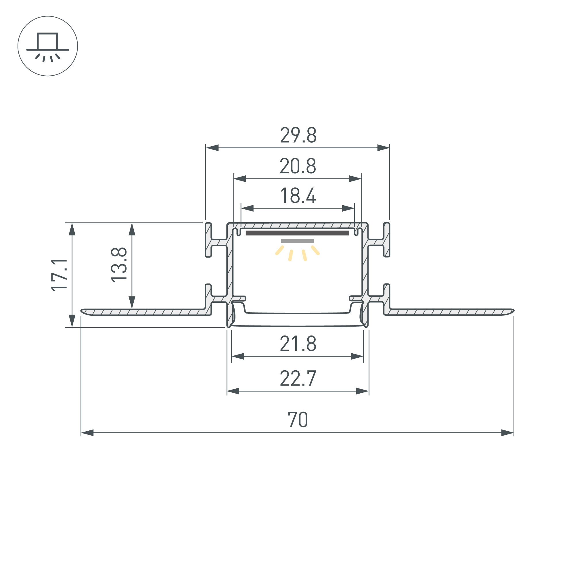 Алюминиевый встраиваемый гибкий профиль для светодиодных лент и линеек. Изгиб вправо/влево. Минимальный радиус изгиба 50 см. Габаритные размеры (L×W×H): 2000х70х17,1 мм. Ширина площадки для ленты 17 мм. Экраны, заглушки и другие аксессуары приобретаются отдельно. Цена за 1 метр. Поставляется в комплекте с мягкой прокладкой для защиты профиля от грязи и пыли.