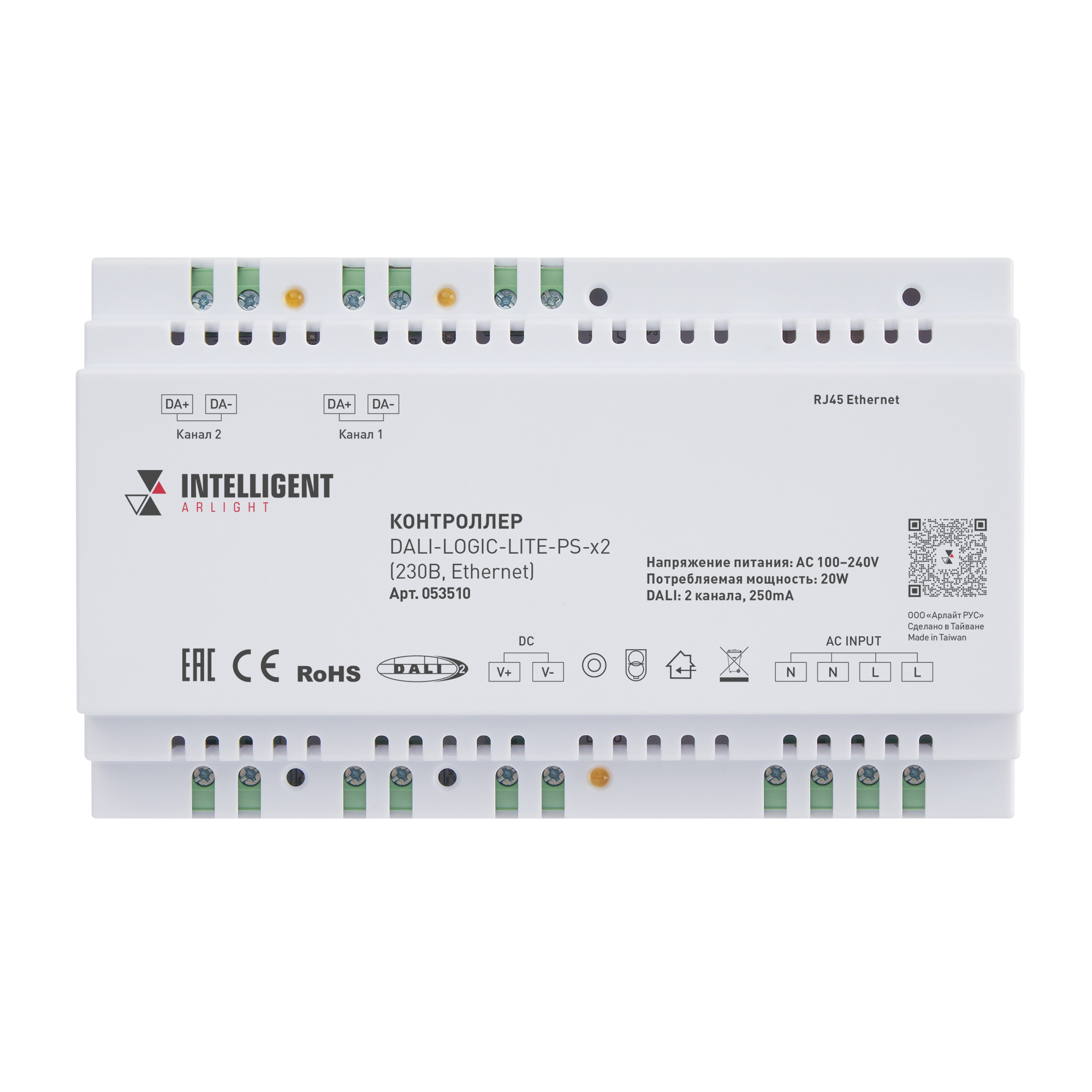 Мастер-контроллер DALI LOGIC LITE предназначенный для управления освещением в системах, использующих протокол DALI. Позволяет настраивать и управлять устройствами DALI в 2 линиях по 64 адреса в каждой, обеспечивает контроль событий, обработку логических функций, работу по таймеру и расписанию. Также, позволяет создавать различные сценарии управления при помощи скриптов, созданных пользователем. Настройка логического контроллера и всего оборудования DALI выполняется с помощью персонального компьютера на базе ОС Windows через Ethernet. Также, устройство позволяет управлять оборудованием DALI с мобильных устройств на базе ОС Android, совместим с iRIDI. Контроллер совместим с оборудованием DALI-2 и интерфейсом DT8. Поддержка функции GRID (распределенная сеть из нескольких контроллеров). Питание от 230В, обеспечивает питание шины DALI. Габариты устройства составляют 152x94x55 мм, установка на DIN-рейку.