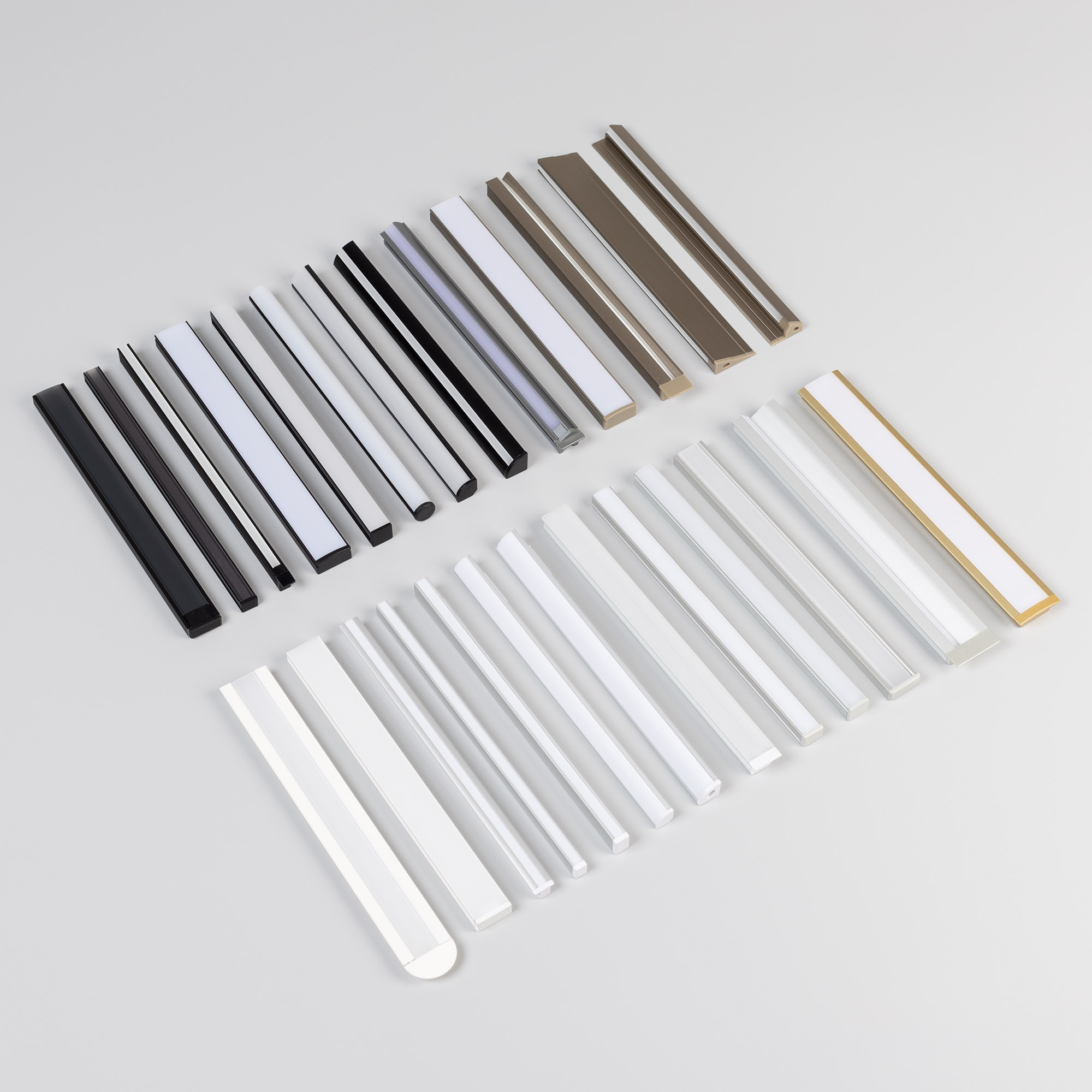 Набор образцов мебельных профилей ARLIGHT с экранами и заглушками. Длина отрезков 150 мм.
