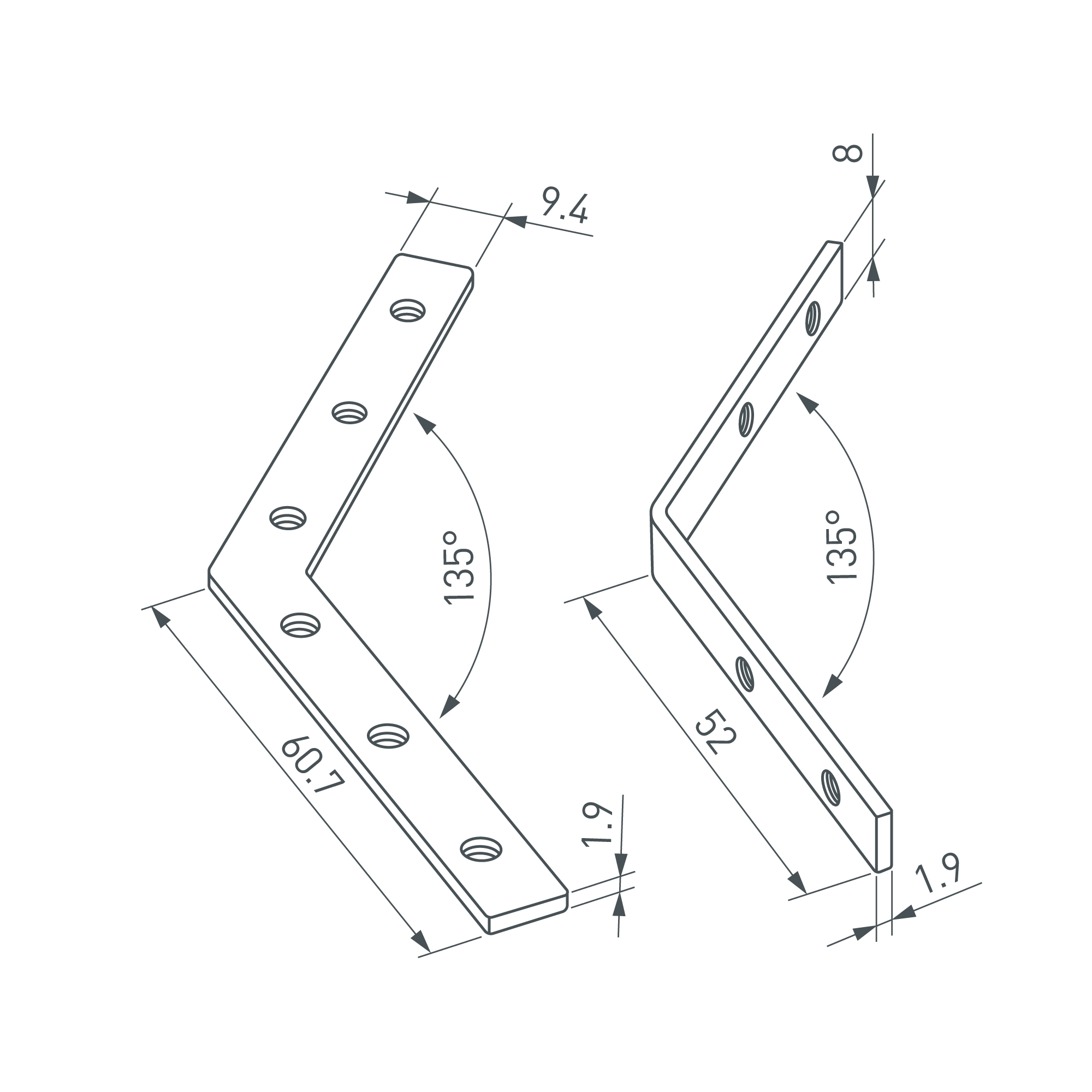 Коннекторы (4 шт. - два внутренних и два внешних) для соединения двух отрезков профилей LINE-6070 под углом 135°. Устанавливаются в паз, фиксируются идущими в комплекте винтами. Применяются при изготовлении светильников сложной геометрии.
