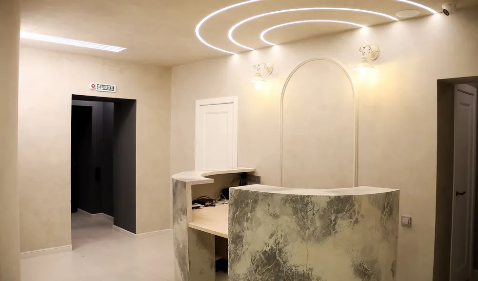 Свет в интерьере клиники соответствует общей концепции дизайна. В отделке использованы холодные оттенки белого и серого, которые подчеркиваются нейтральным дневным светом (4000 К).