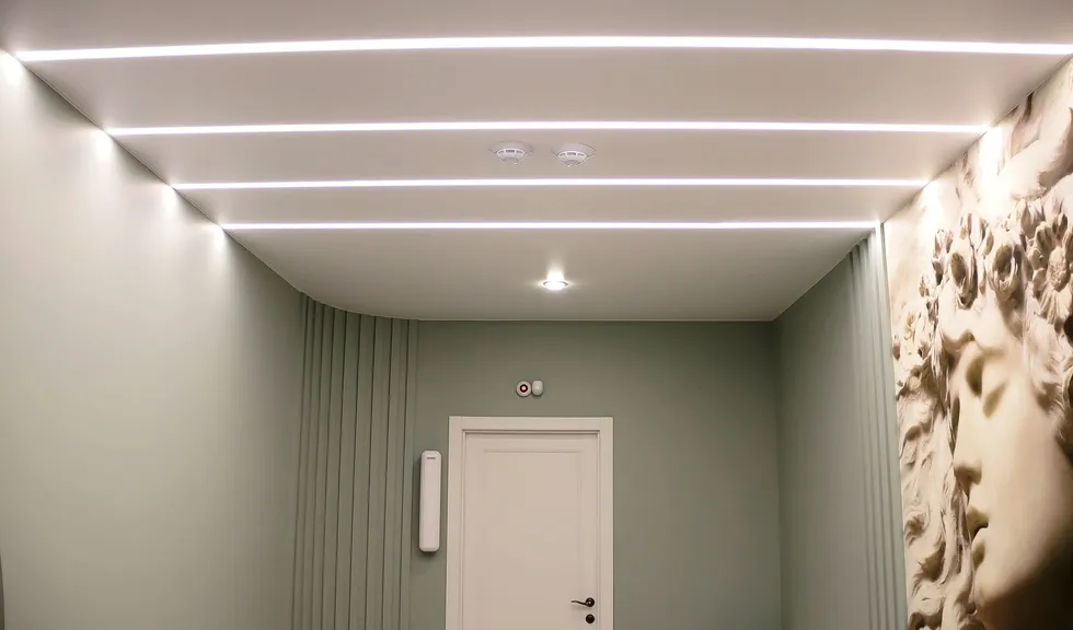 Минималистичный стиль интерьера отражен в освещении: компактные, энергоэффективные светильники обеспечивают комфорт для работы персонала. Основное решение — линейные модели на основе LED-лент и алюминиевых профилей. Такие профильные светильники создают равномерное освещение, сохраняя легкость пространства. В технических зонах и входных группах также соблюден единый стиль.