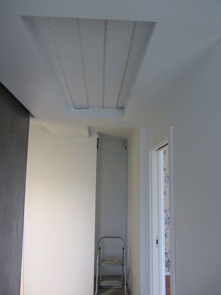 В прихожей и коридоре применено сразу две технологии монтажа потолков - гипсокартон и натяжной потолок. При помощи гипсокартона уровень потолка был опущен, появились ниши для декоративной подсветки и прямоугольные секции - углубления для организации основного освещения. В эти углубления, как и в ванной комнате, была установлена мощная двухрядная светодиодная лента Arlight дневного белого свечения. После установки светодиодных лент будет смонтирован натяжной потолок, который будет находиться вровень с гипсокартонным потолком. Таким образом получится единая поверхность потолка с прямоугольными светящимися участками.