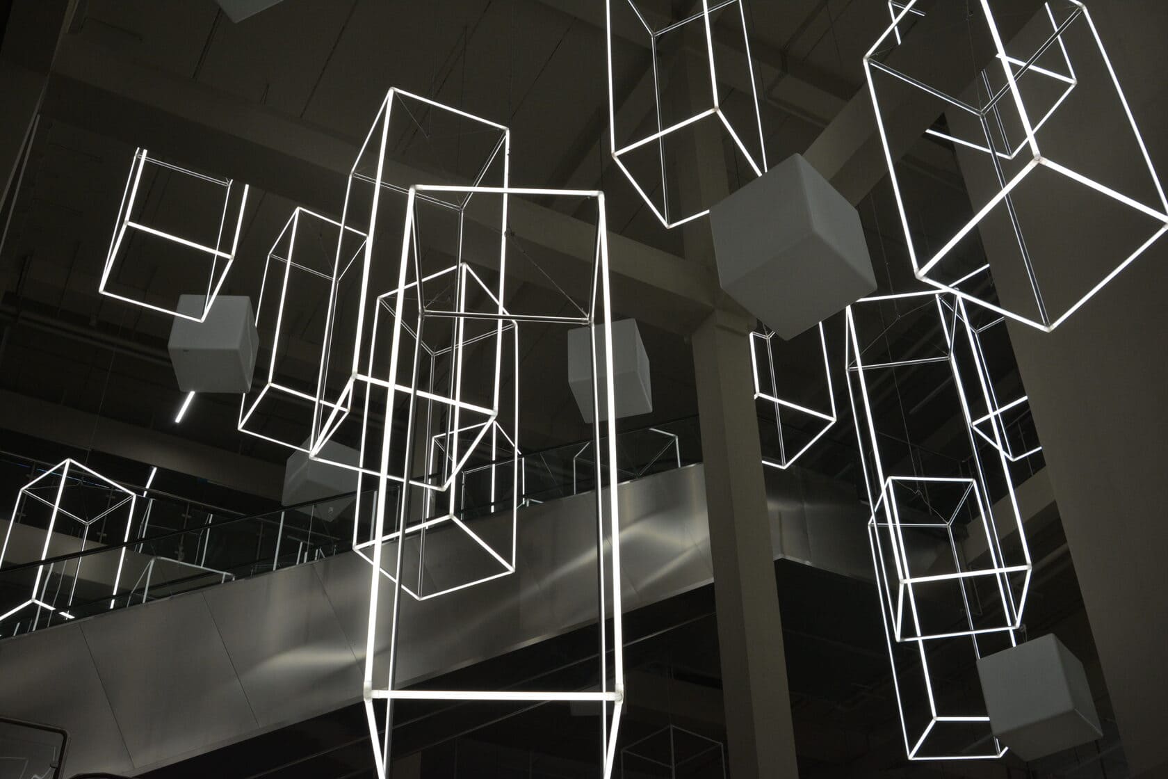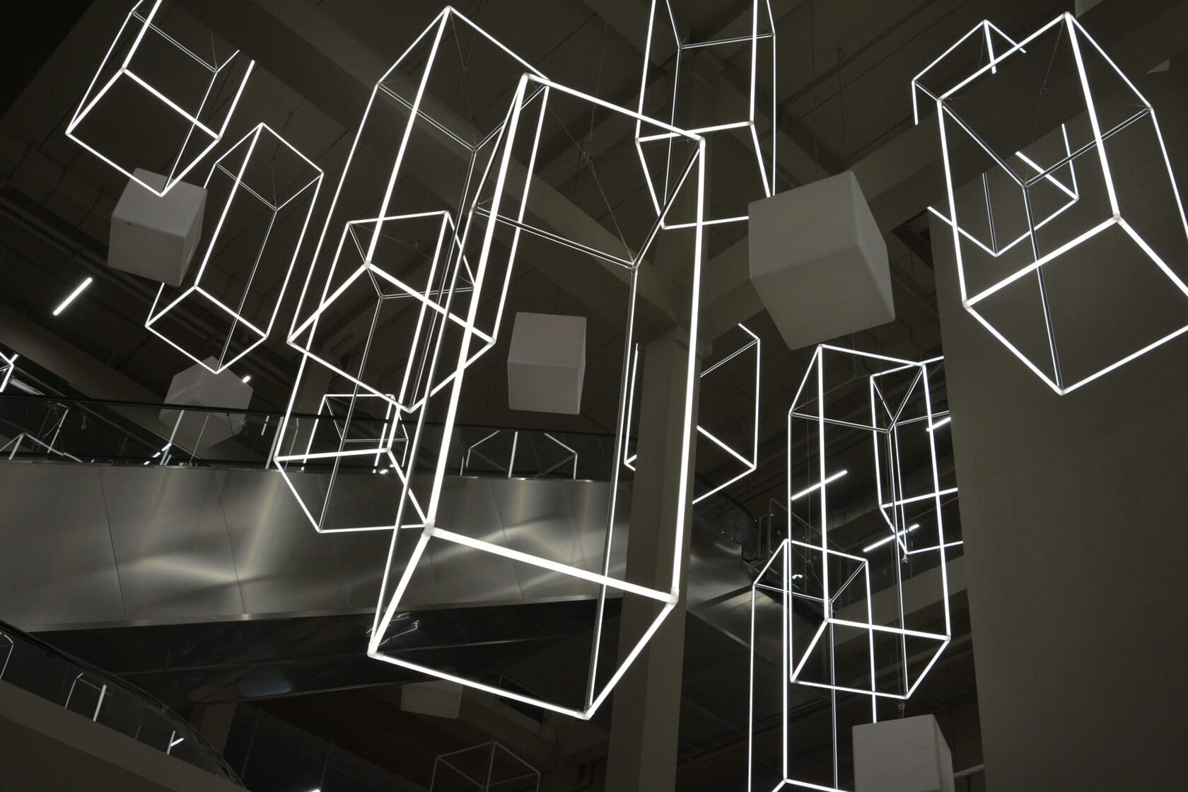 С этой целью для атриума торгового центра «Парк» были созданы светодиодные инсталляции в форме параллелепипедов. Подвесные конструкции со светящимися гранями смотрятся оригинально и воздушно: они заполняют пространство атриума, перекликаясь с другими кубическими элементами дизайна.